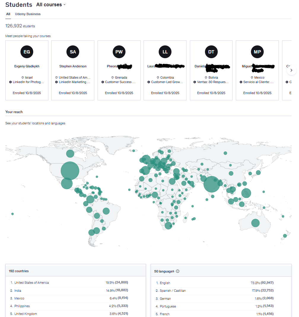 Cientos de recomendaciones en LinkedIn y 35.000 en Udemy